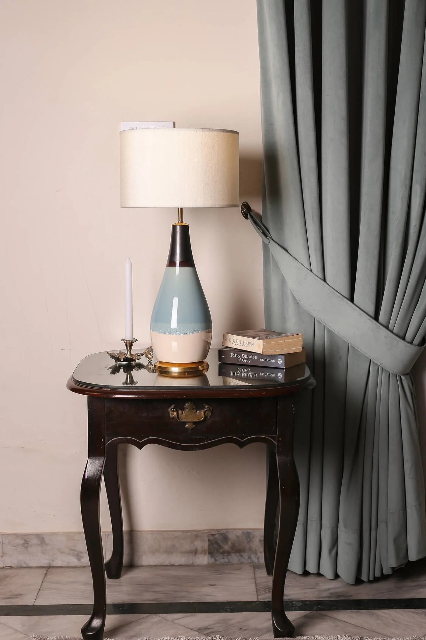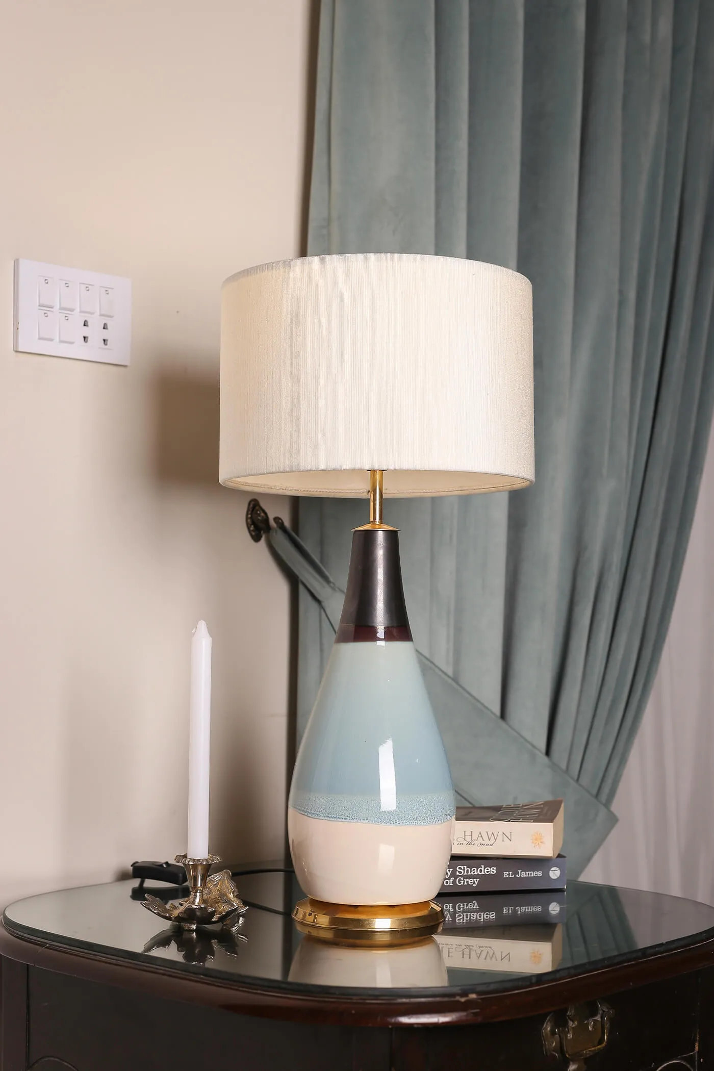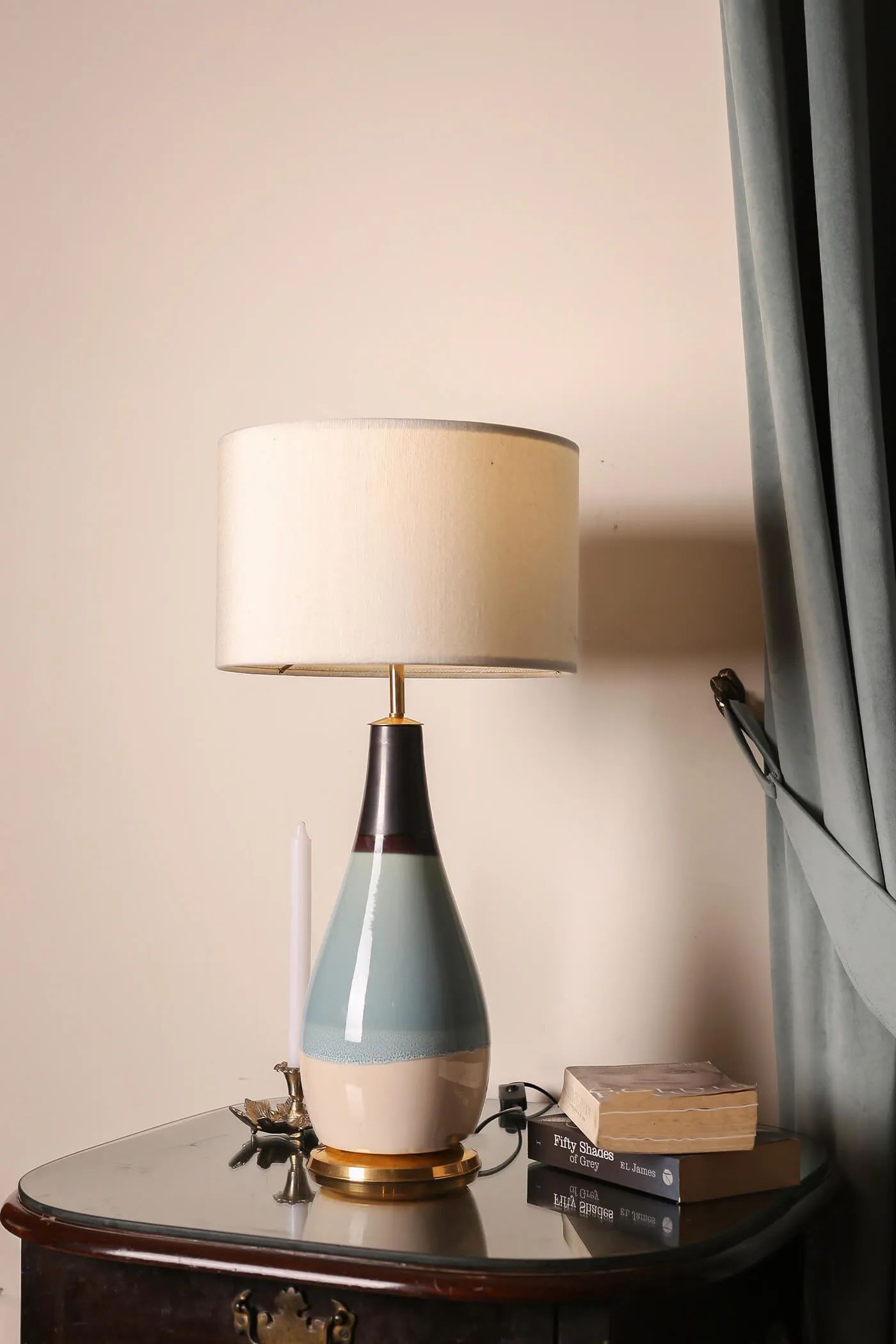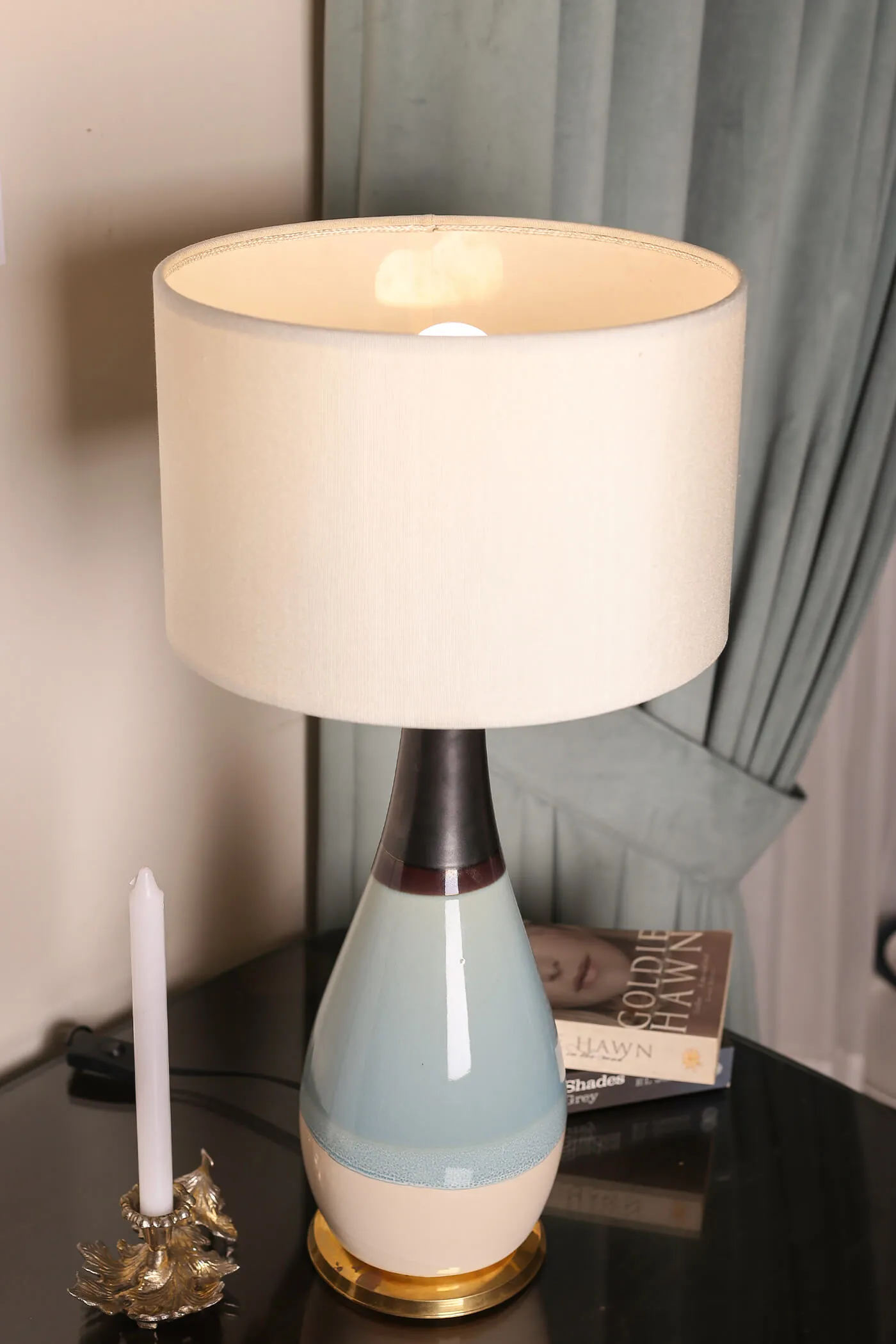 Crafted from high-quality ceramic. Offering durability and a smooth polished surface. The body of the lamp features a distinctive design with three sections, each adorned with a different shade with a brass rim at the base. The shade’s marble texture lends a sense of luxury and refinement. Elevating the lamp’s overall aesthetic and making it a stunning focal point in any room.