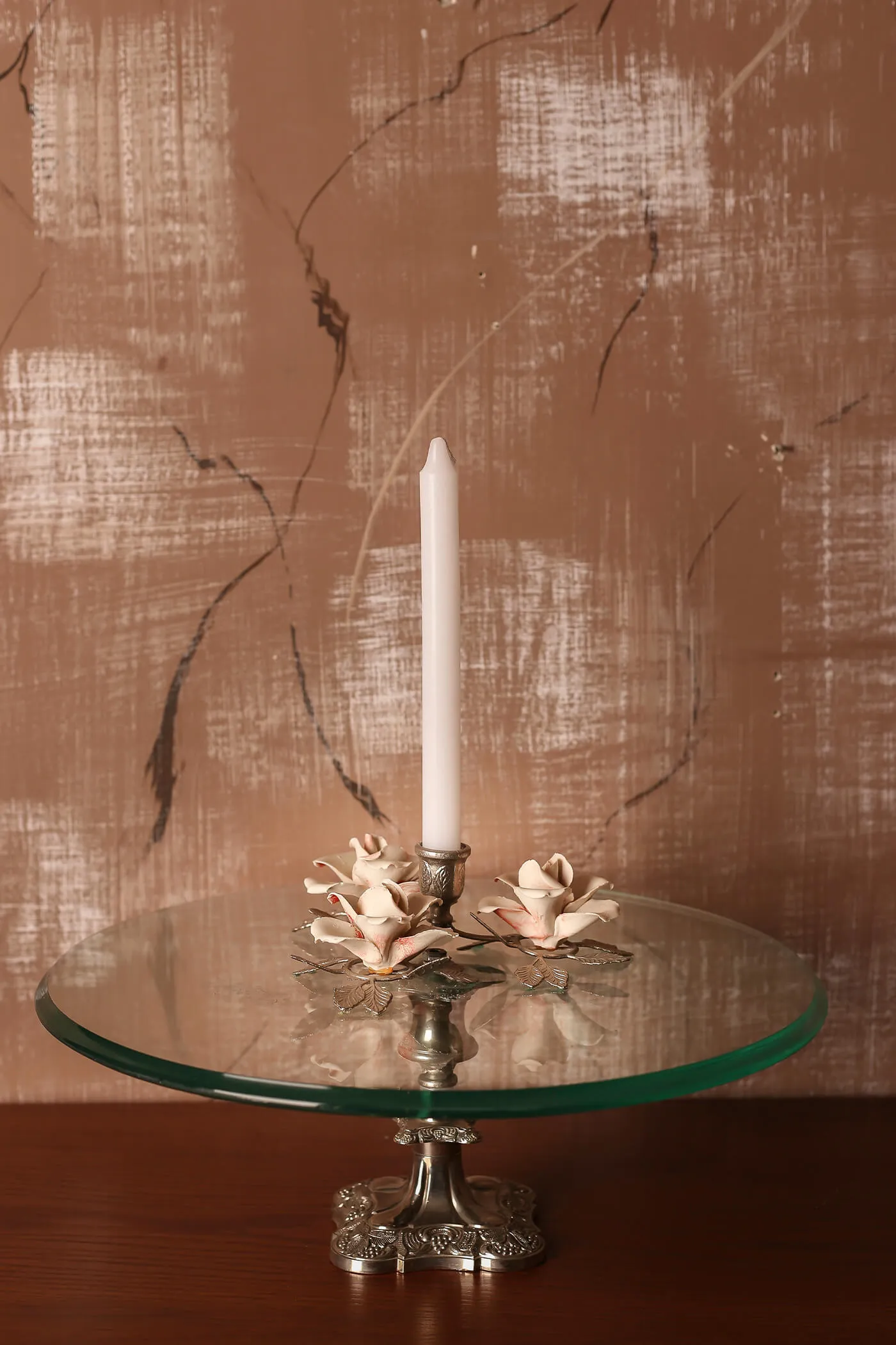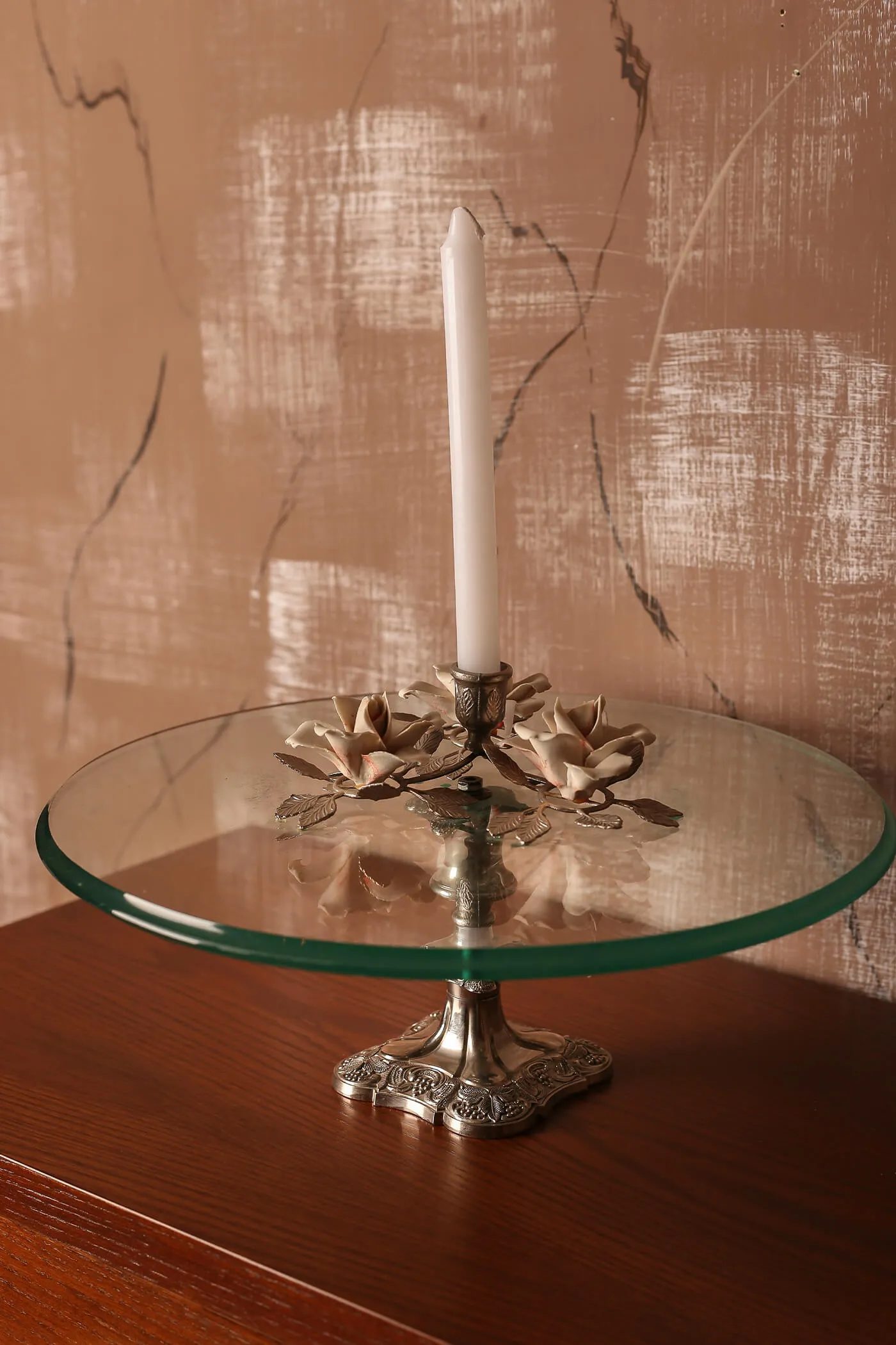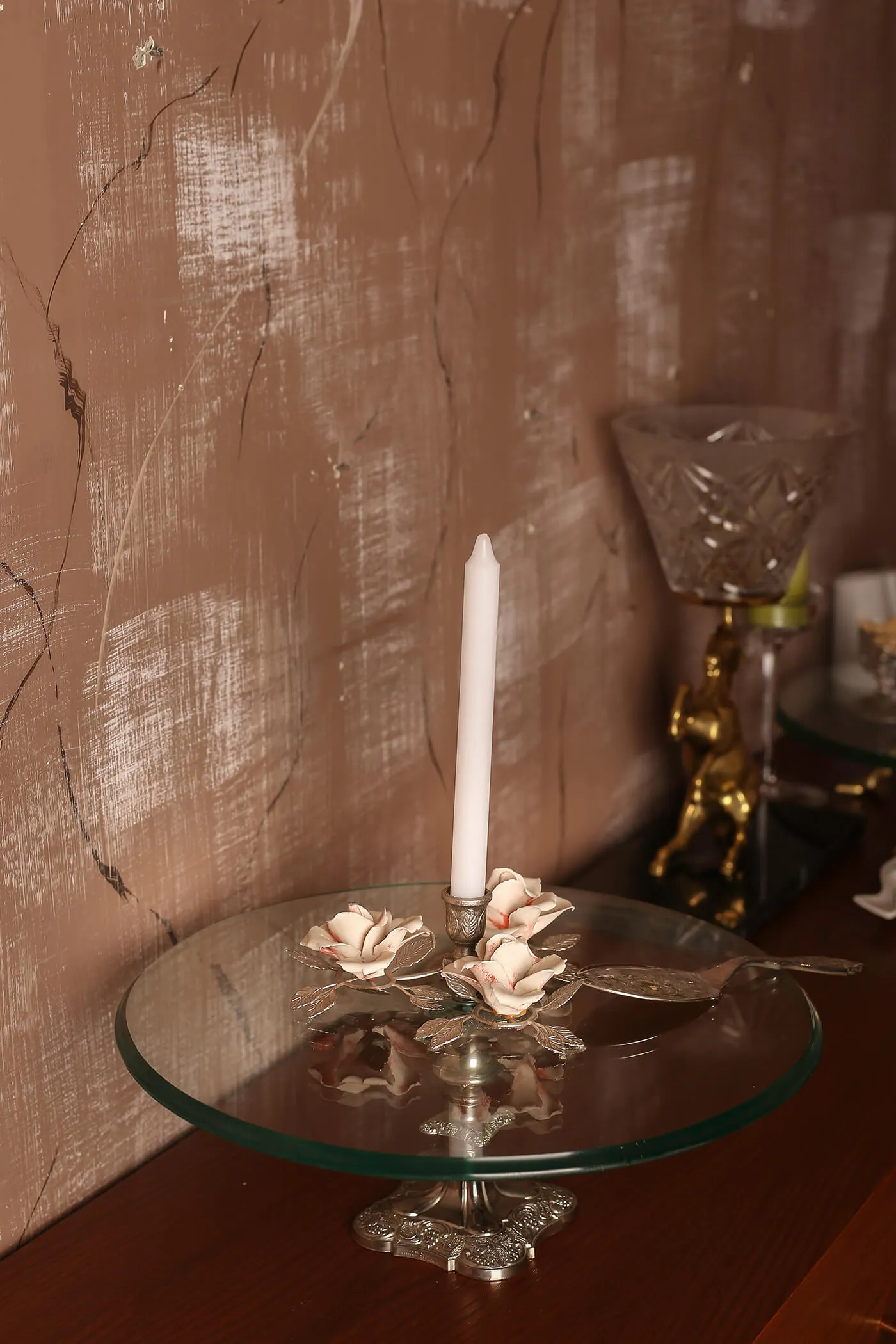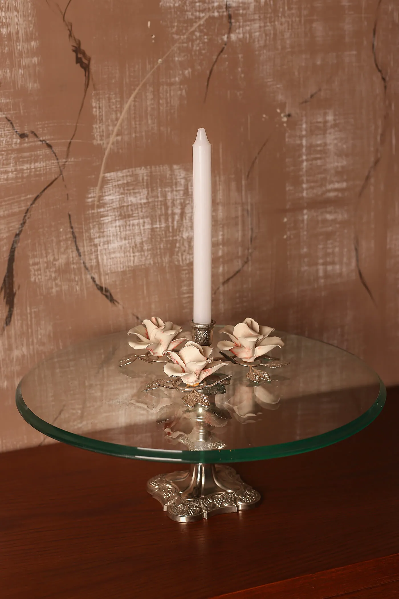 At the heart of this candle stand lies a sturdy platter, meticulously crafted to cradle your favorite candles with effortless poise. Surrounding the central candle, three delicate lily flowers bloom in everlasting splendor, their intricate petals exuding a sense of natural serenity and timeless charm. The base of the platter is made of sturdy brass.