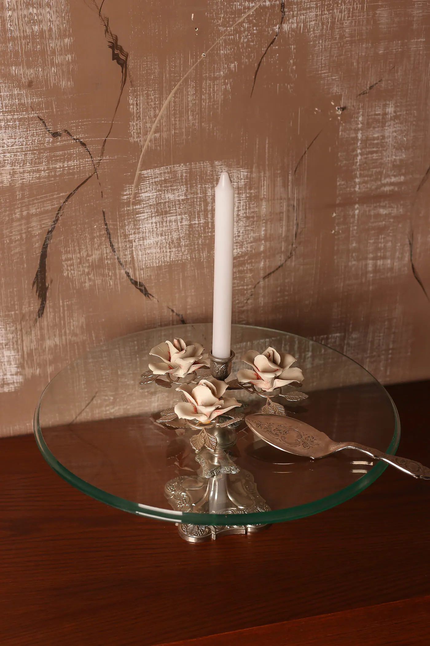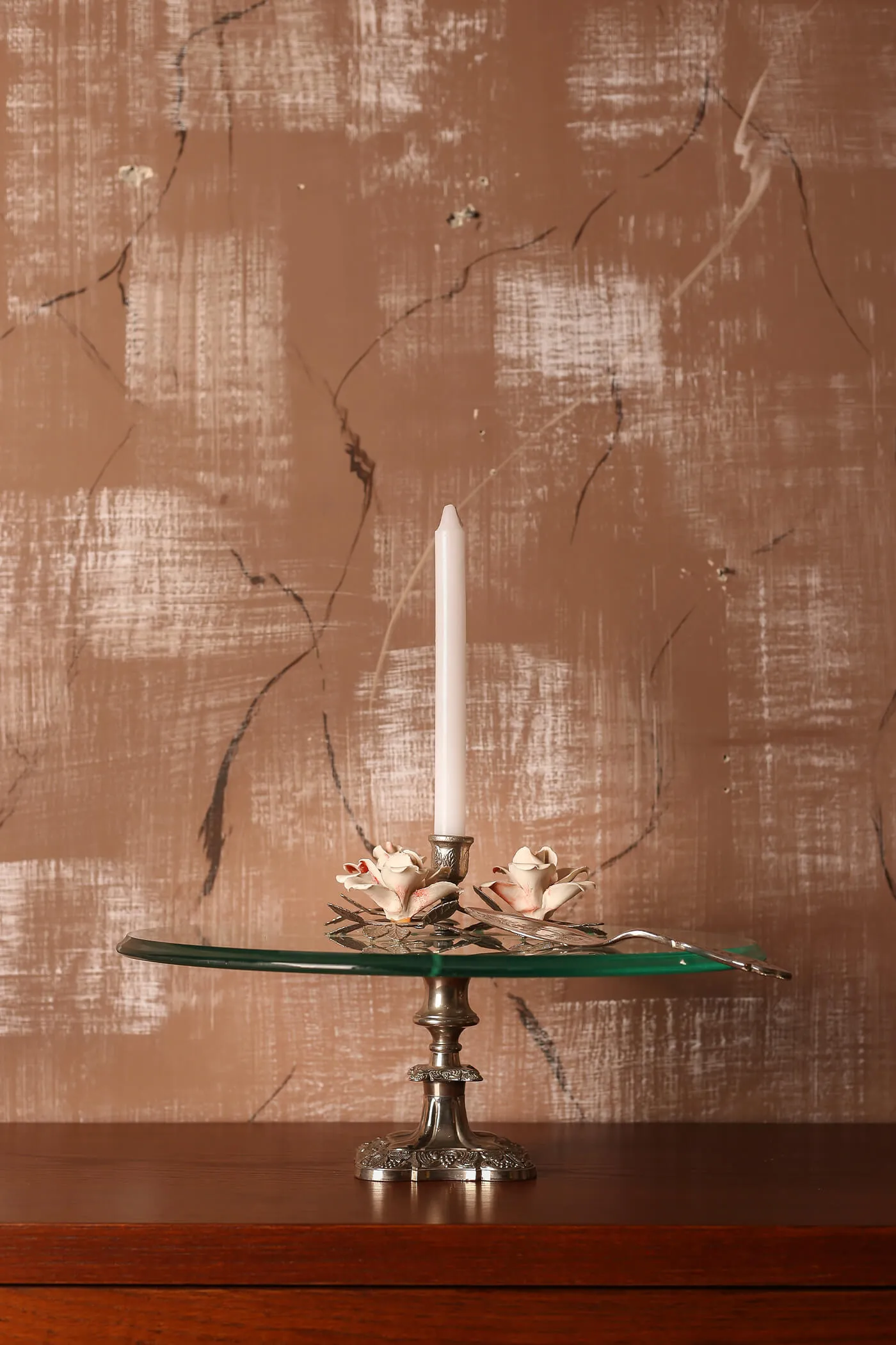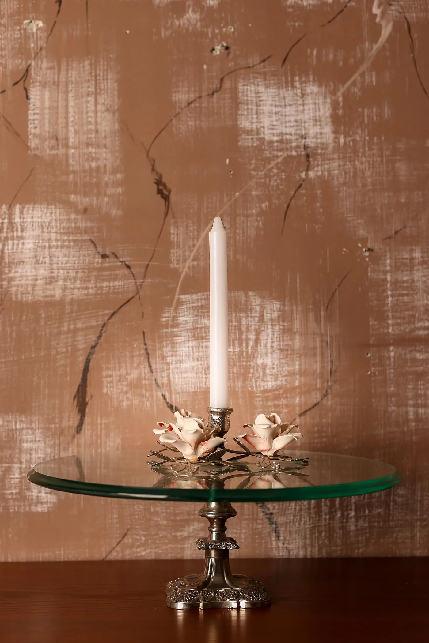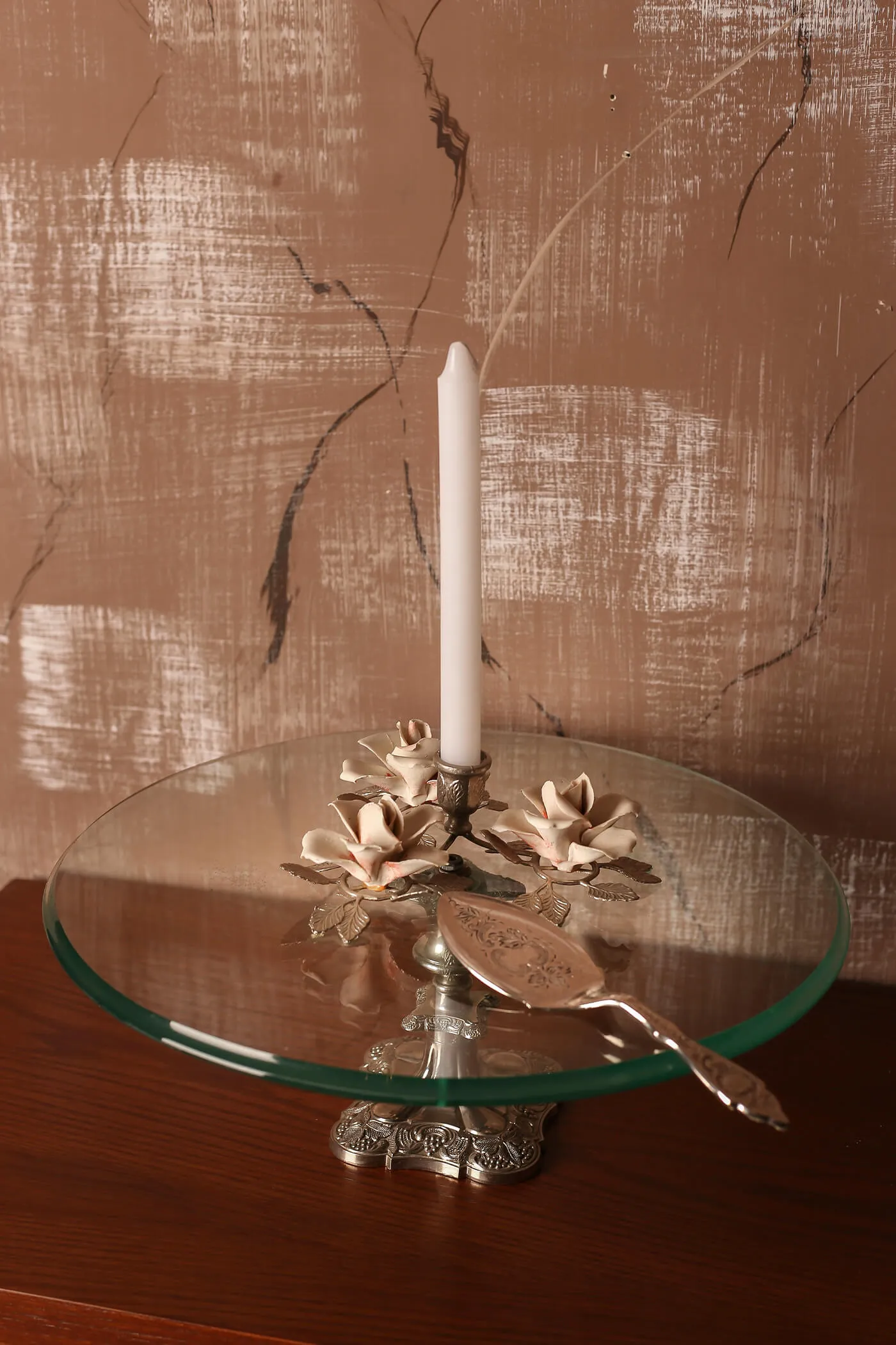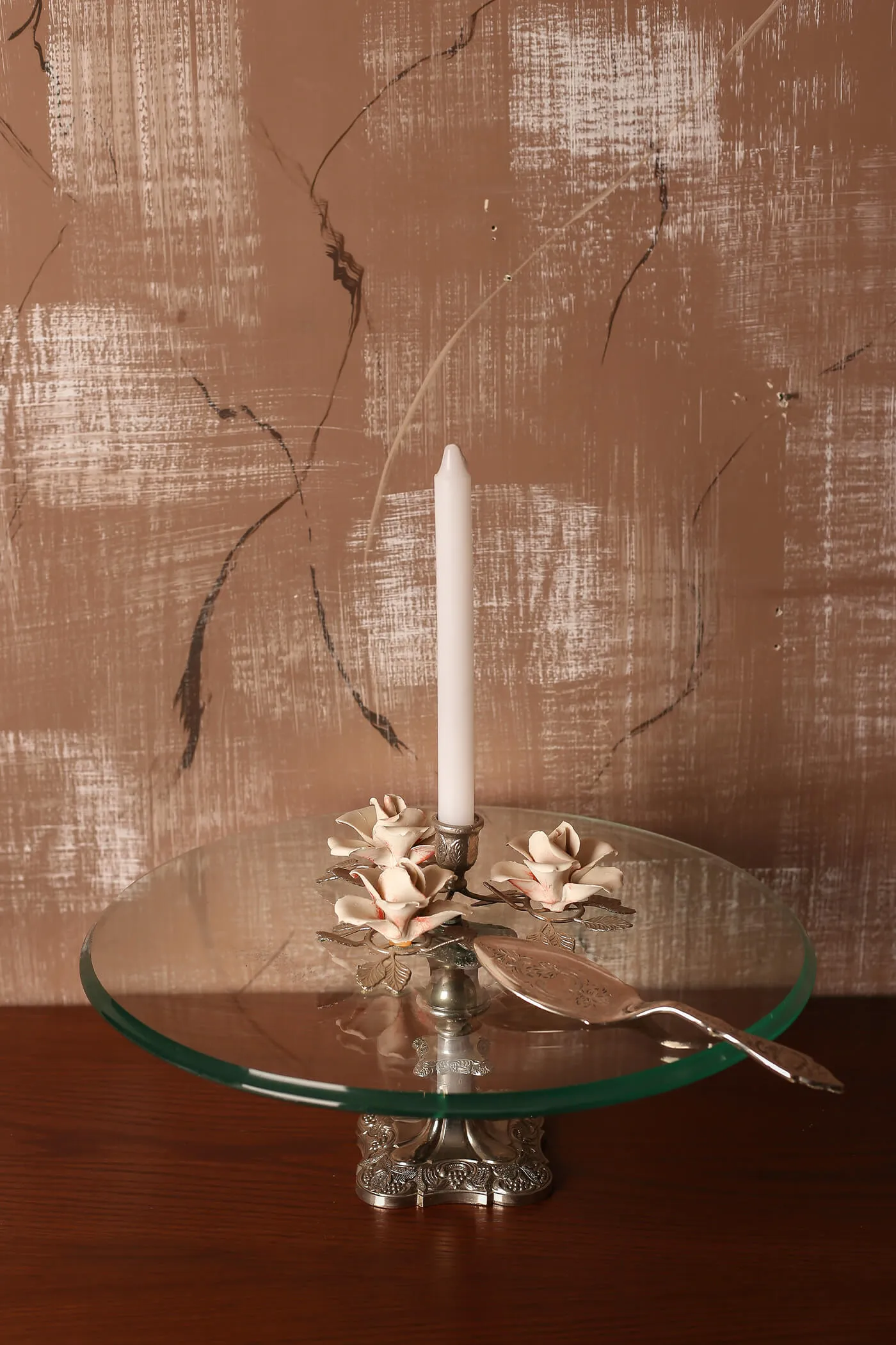 At the heart of this candle stand lies a sturdy platter, meticulously crafted to cradle your favorite candles with effortless poise. Surrounding the central candle, three delicate lily flowers bloom in everlasting splendor, their intricate petals exuding a sense of natural serenity and timeless charm. The base of the platter is made of sturdy brass.