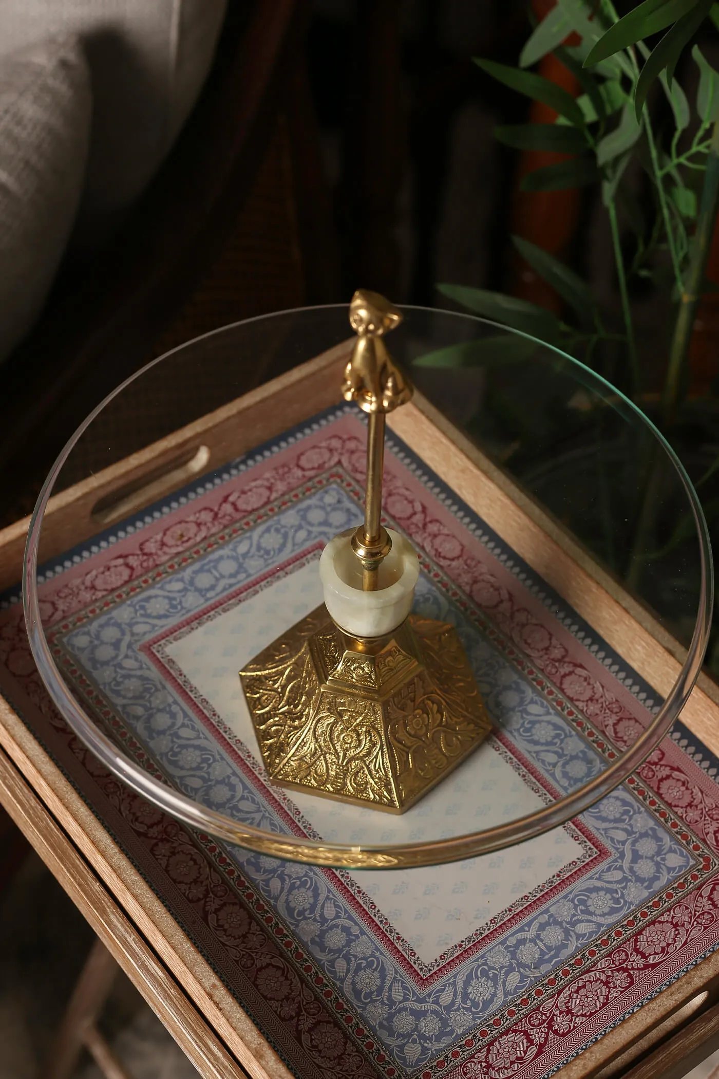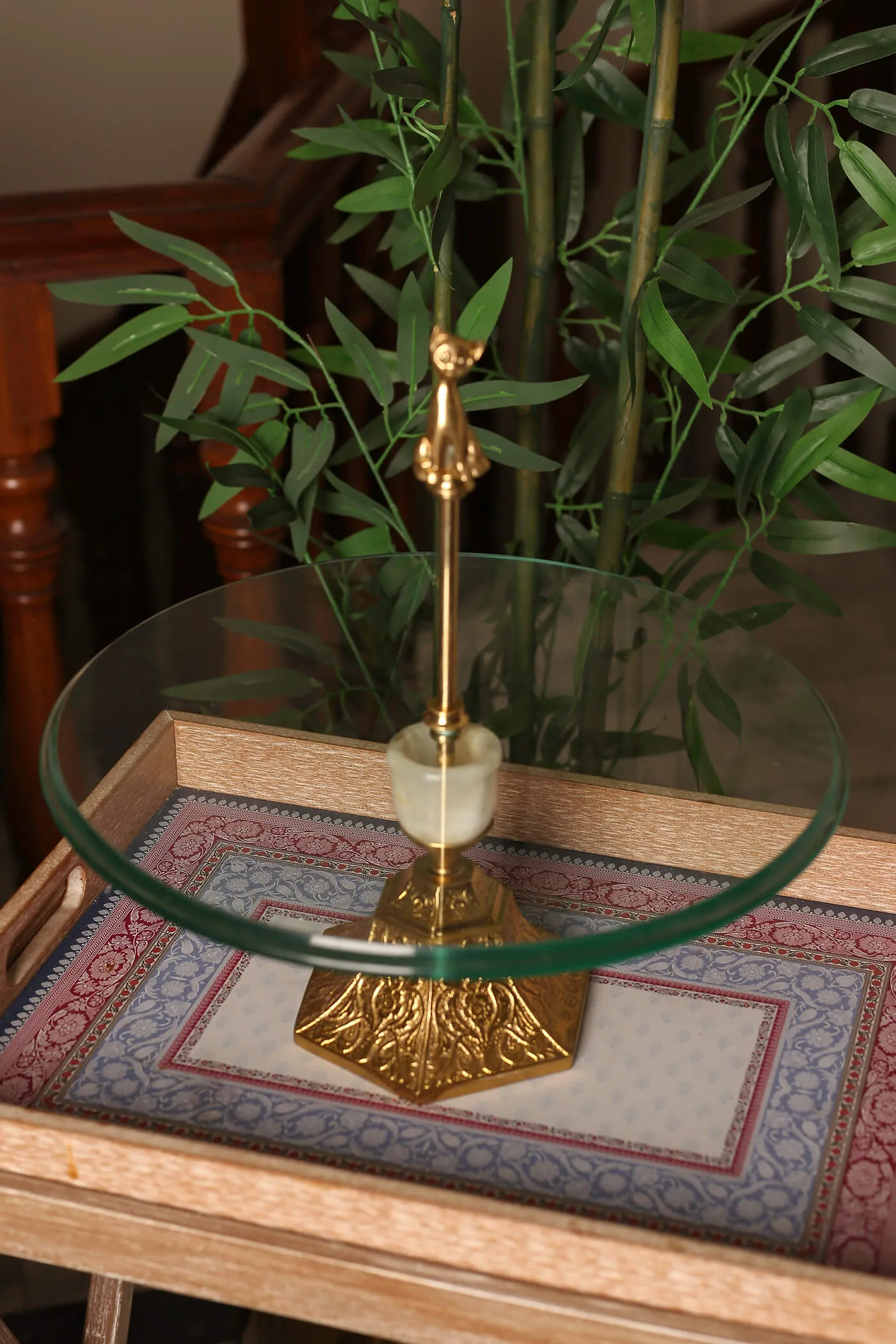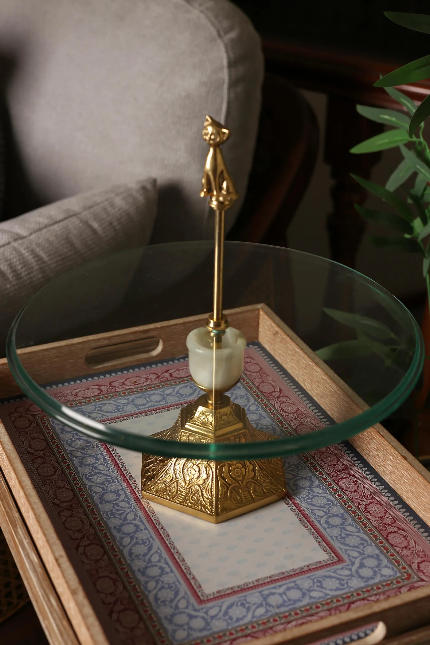At its center, a pristine glass platter provides a pristine stage for presenting delectable treats or cherished decorative items. Resting gracefully atop a sturdy brass stand. Adding a playful twist to the ensemble, a whimsically crafted cat figurine serves as a holder