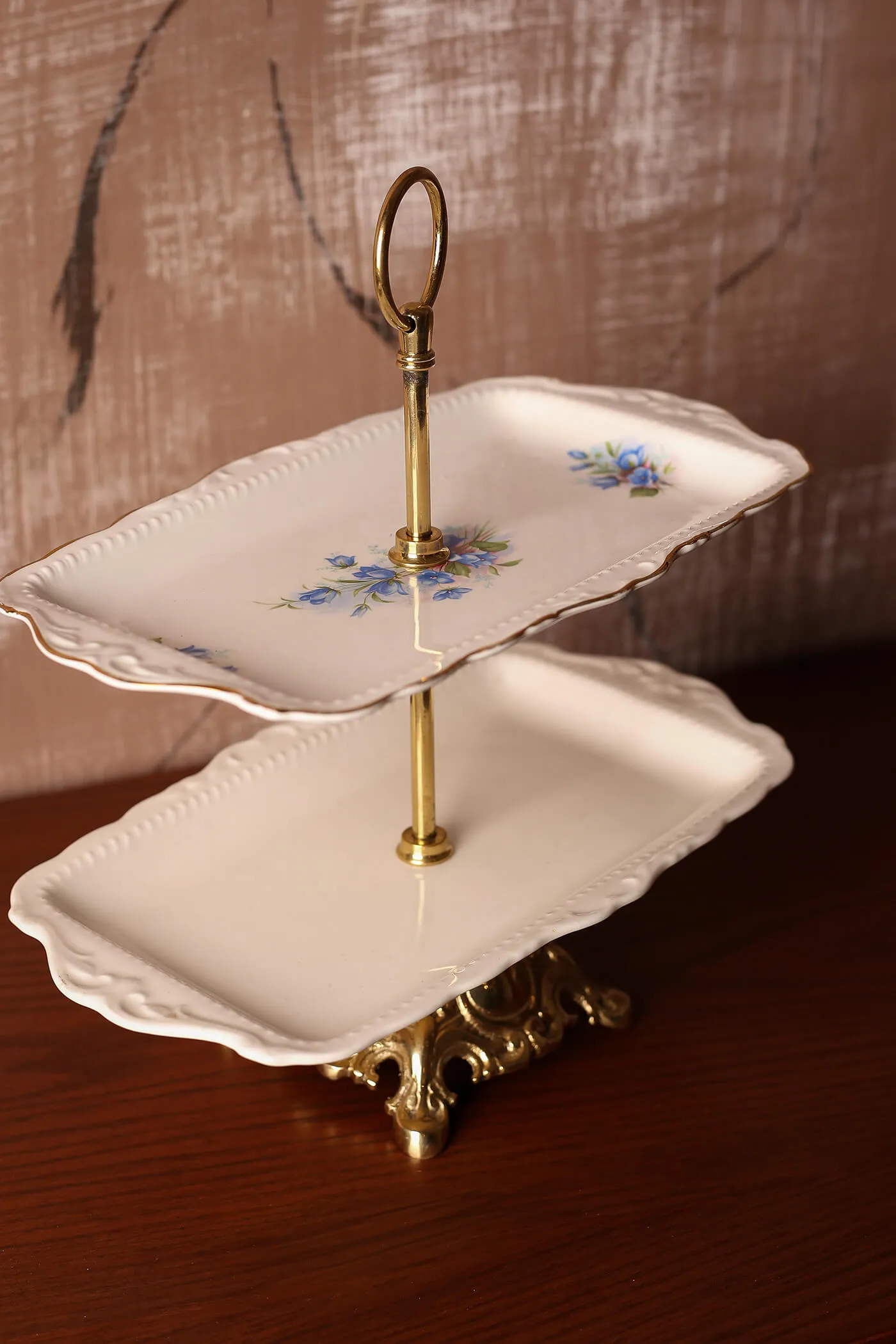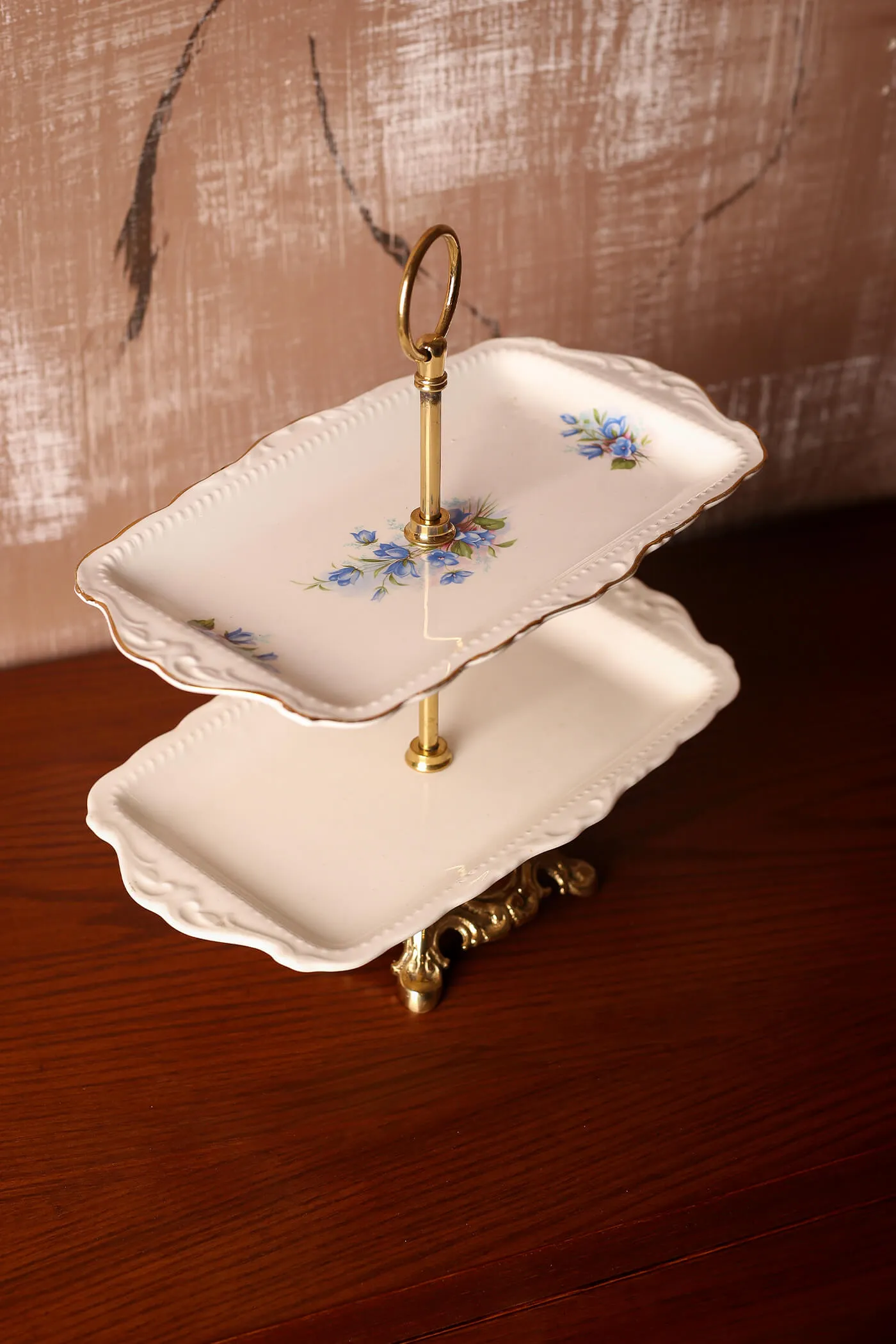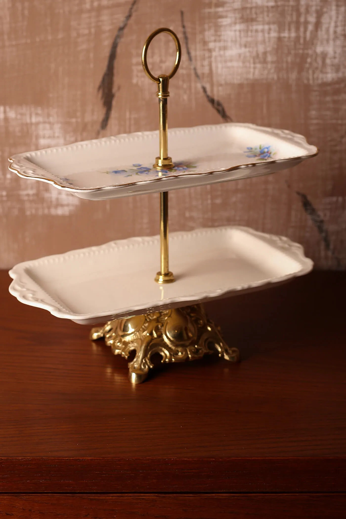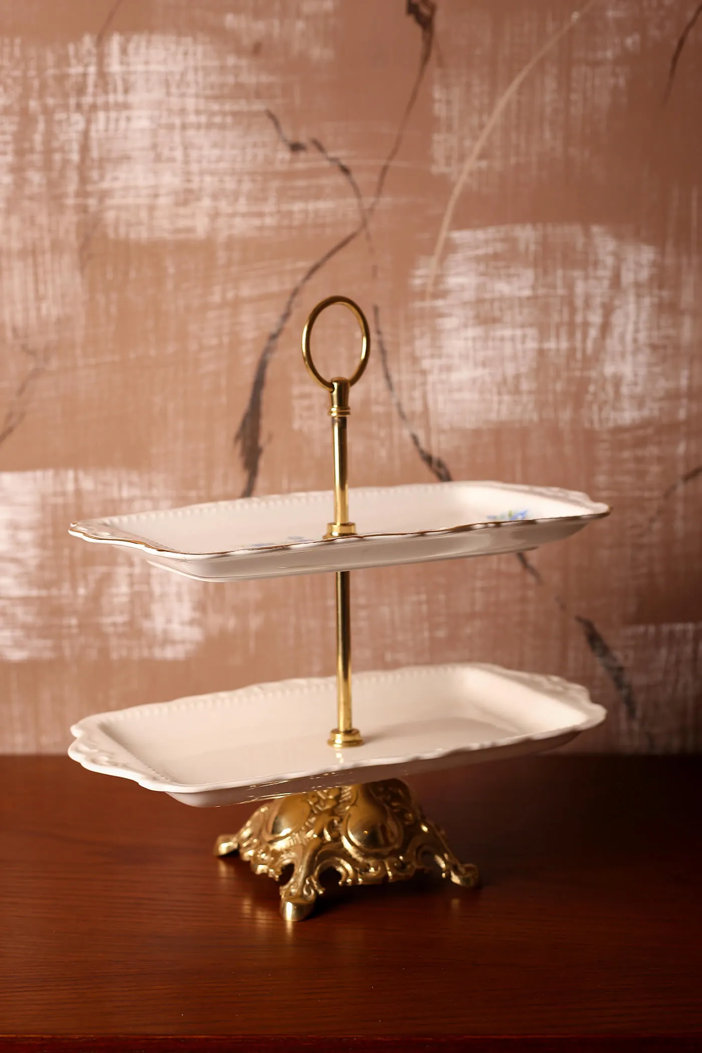 Stunning Ceramic Two-Tier Platter, a masterpiece of elegance and functionality for your dining or entertaining needs. Made of pure brass holder with engraved base