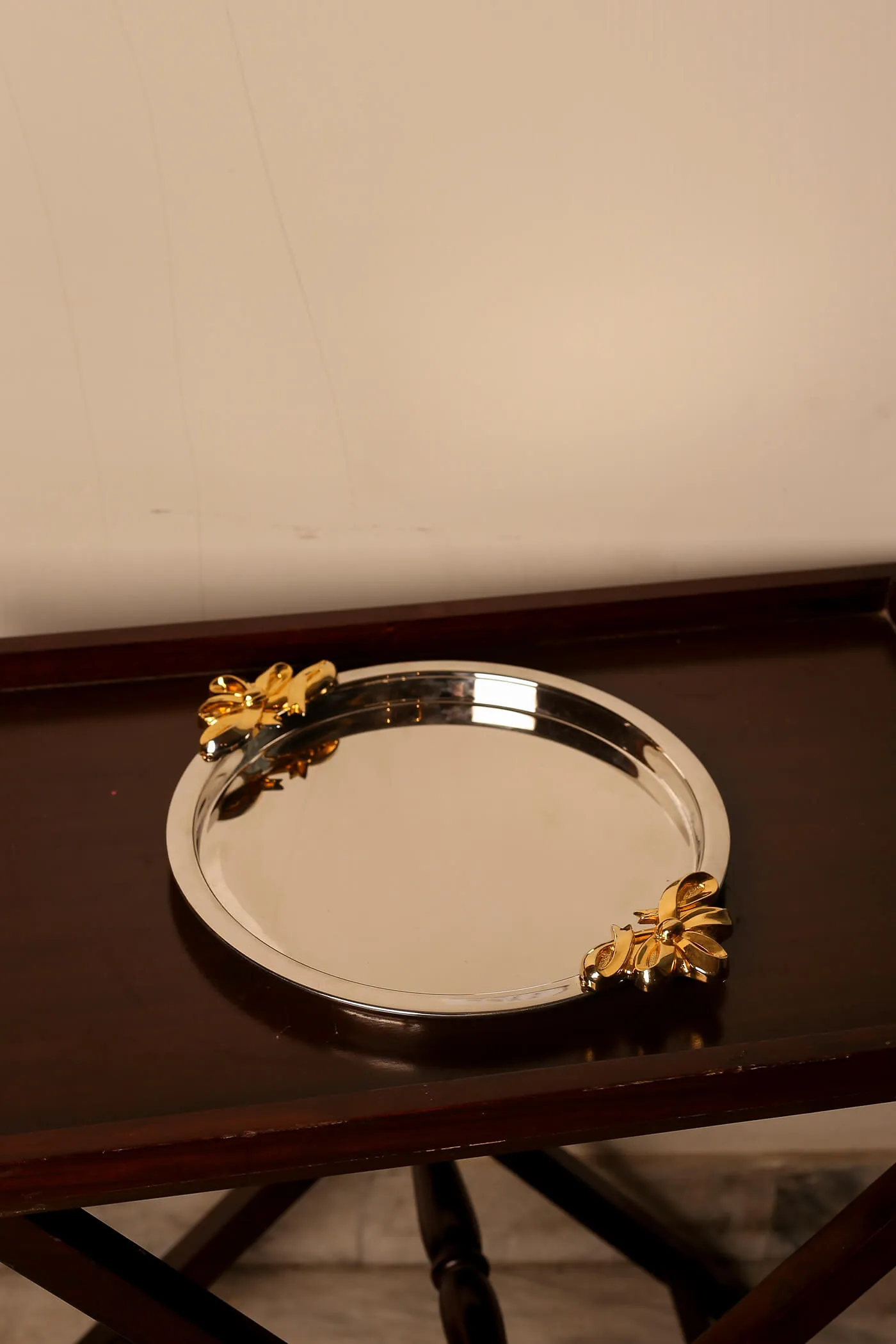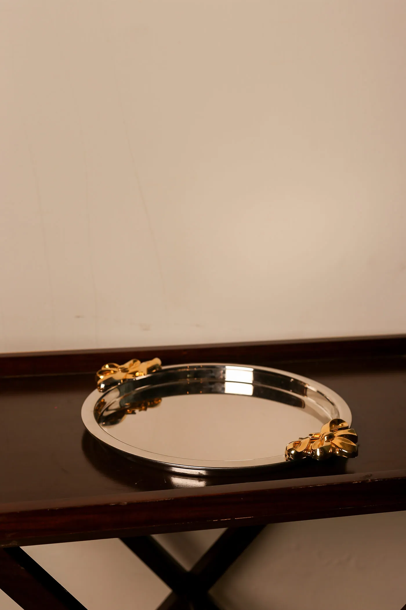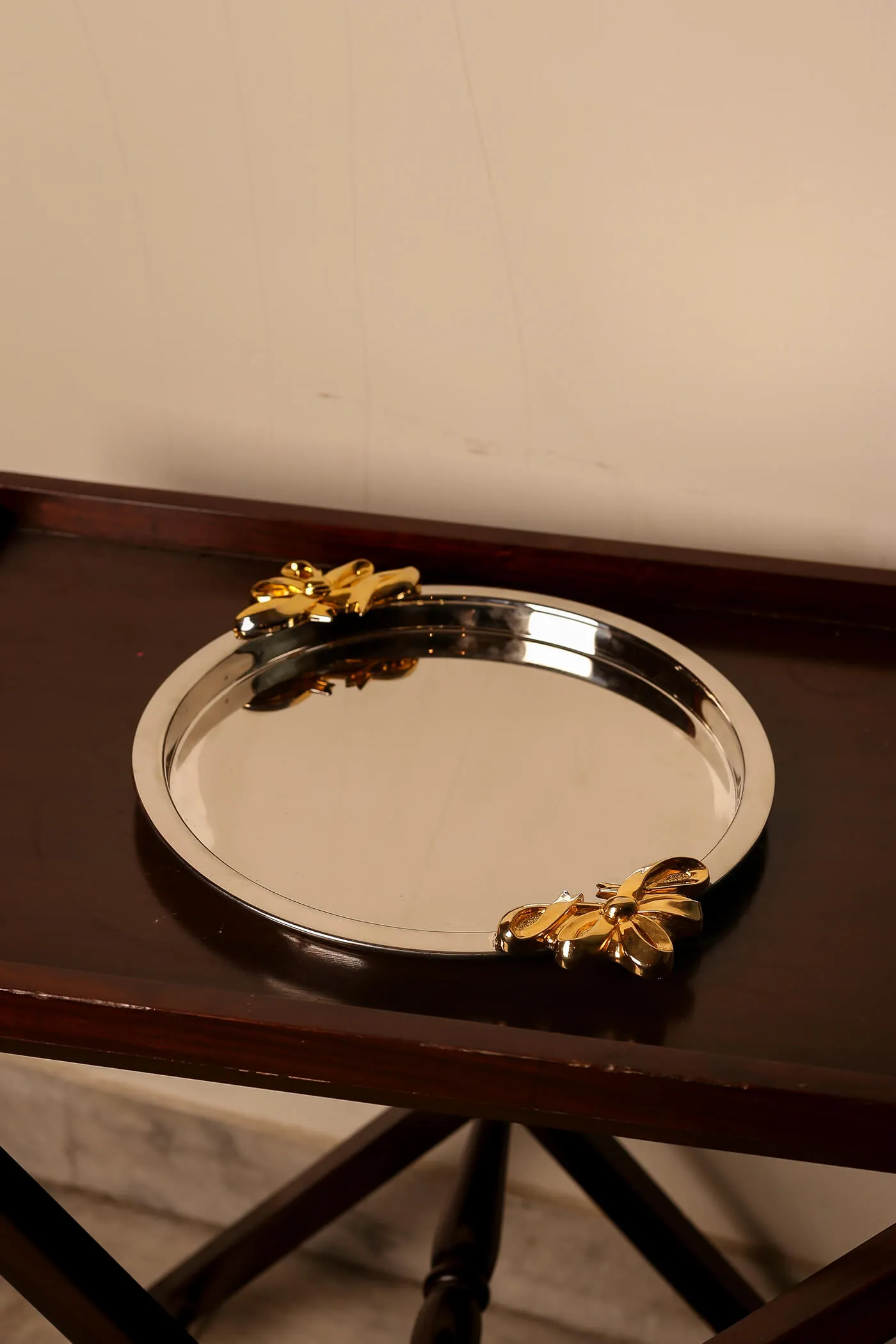 Gleaming silver surface tray with two intricately designed gold-colored flower holders on either sides.