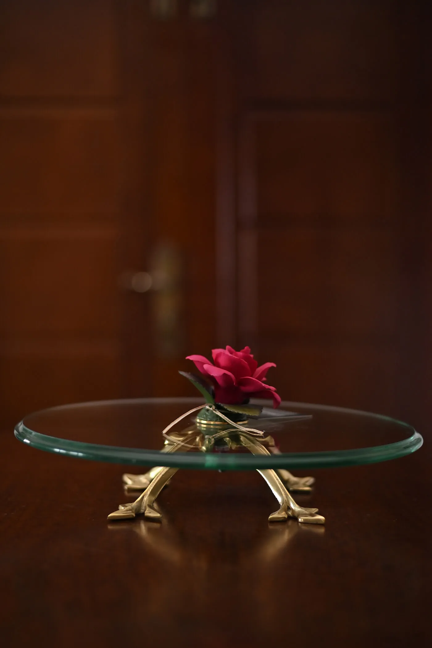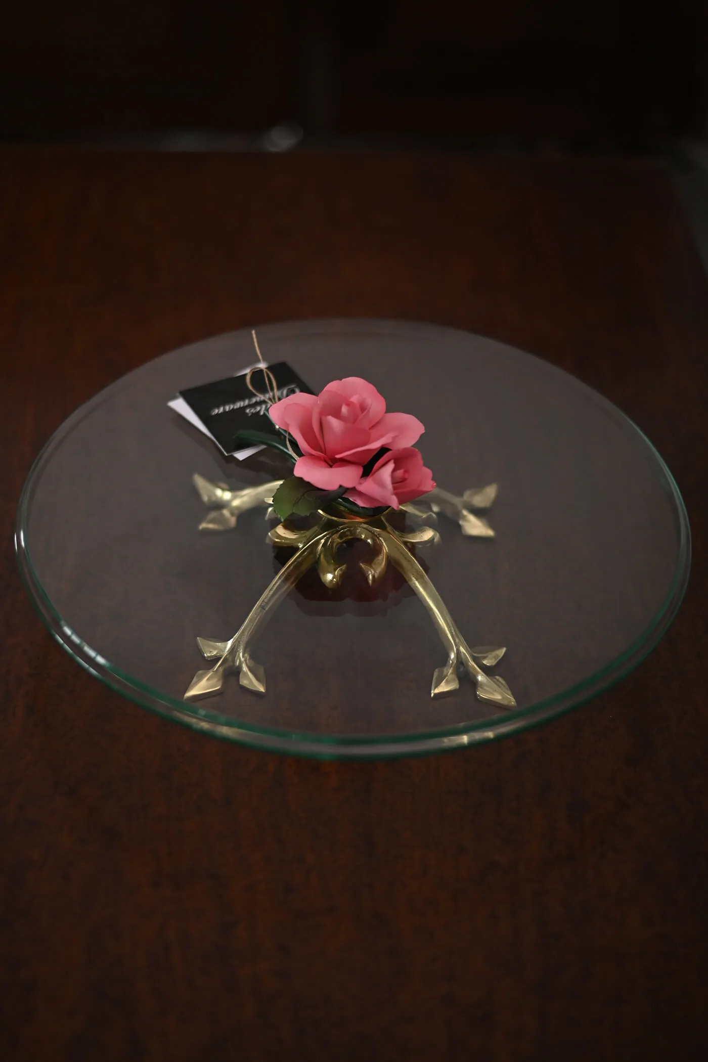 The pink rose, with its soft hues and delicate petals, serves as the focal point of the platter. The brass base showcases intricate detailing. Perfect for serving desserts, or any culinary creation, the Rose Radiance Brass Platter adds a touch of elegance and sophistication to any occasion