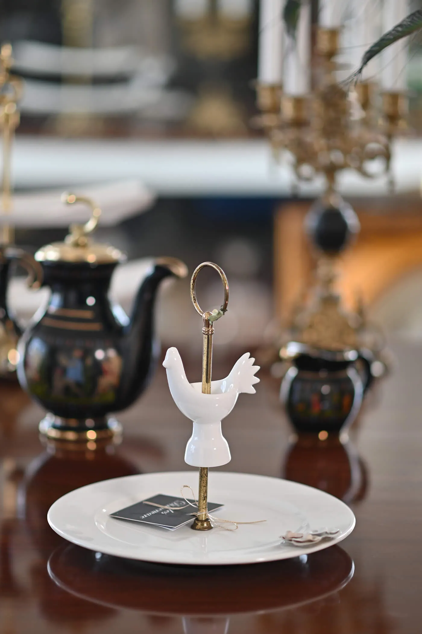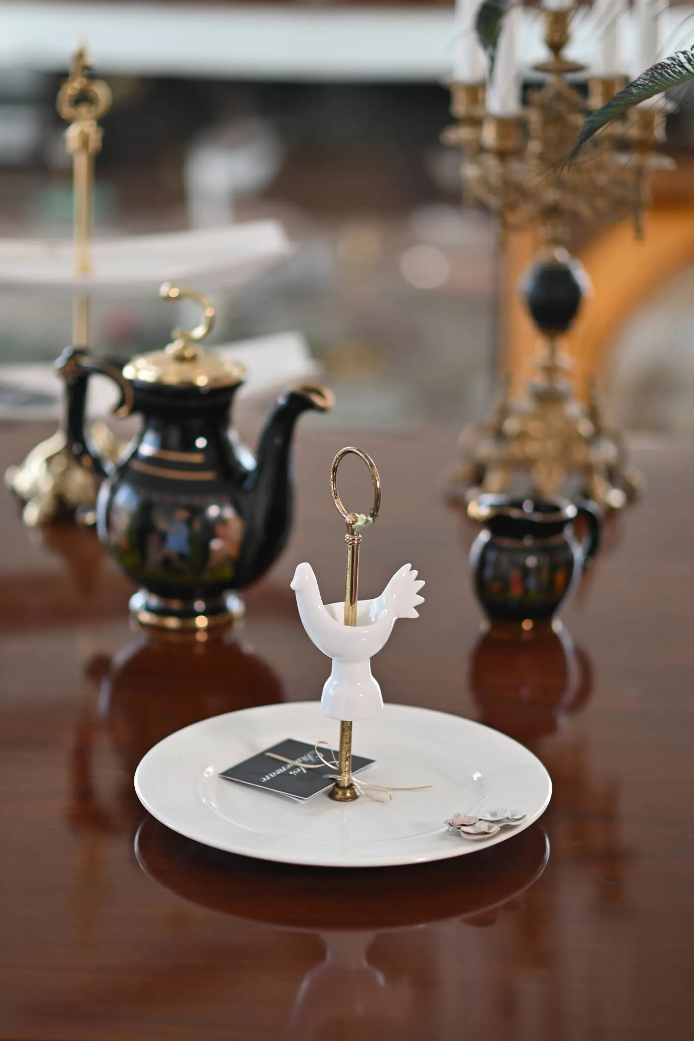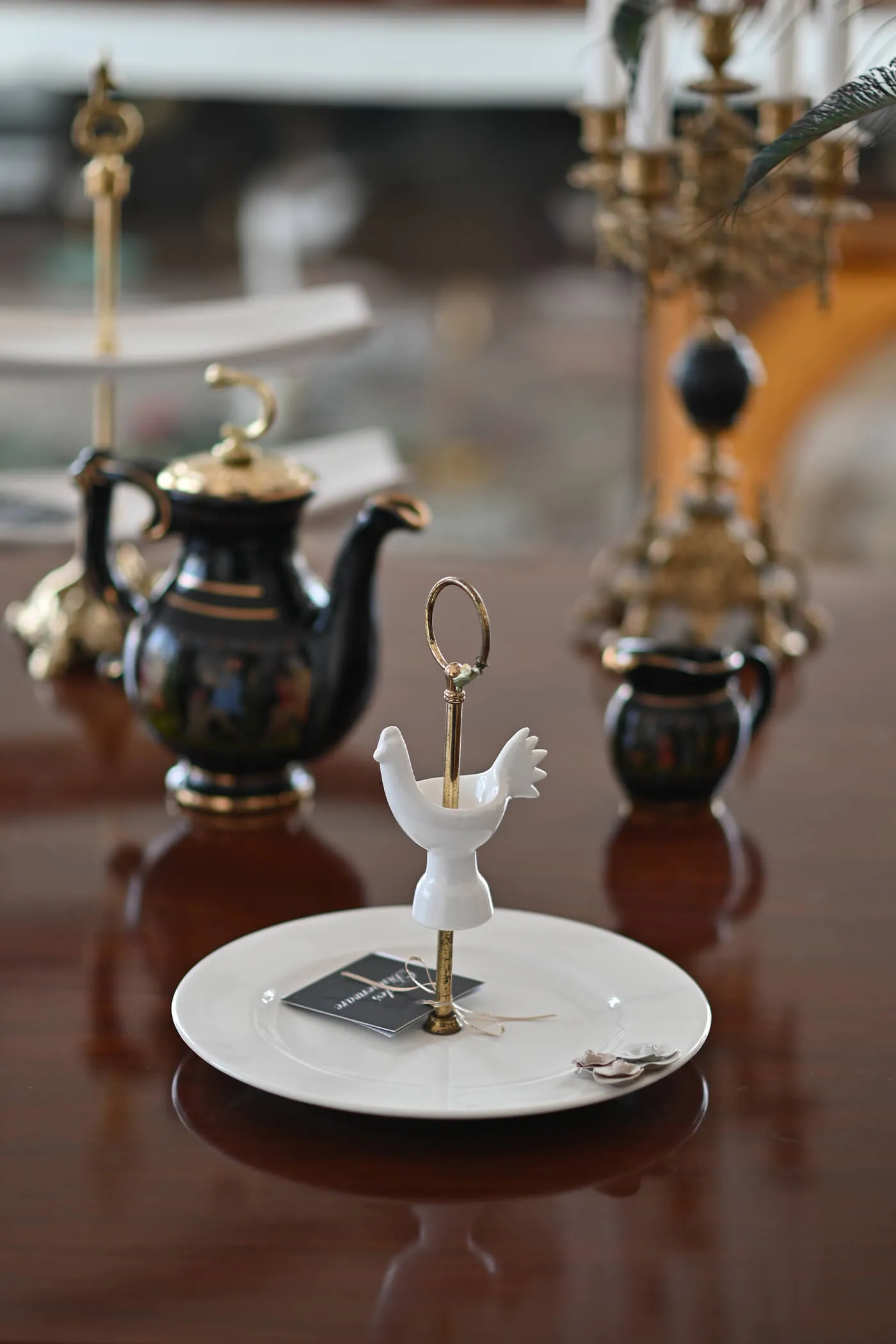 white ceramic platter with brass holder and at the heart of the brass holder rests a charming ceramic cock. Can be used for serving appetizers, showcasing desserts, or simply as a decorative accent.